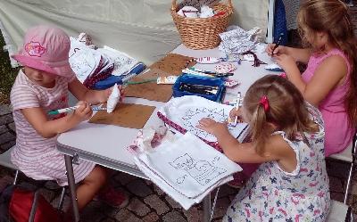 Nabízím i dětskou textilní dílničku. Děti si mohou vybarvit nebo potisknout ušitou peněženku, taštičku nebo malý přívěsek.